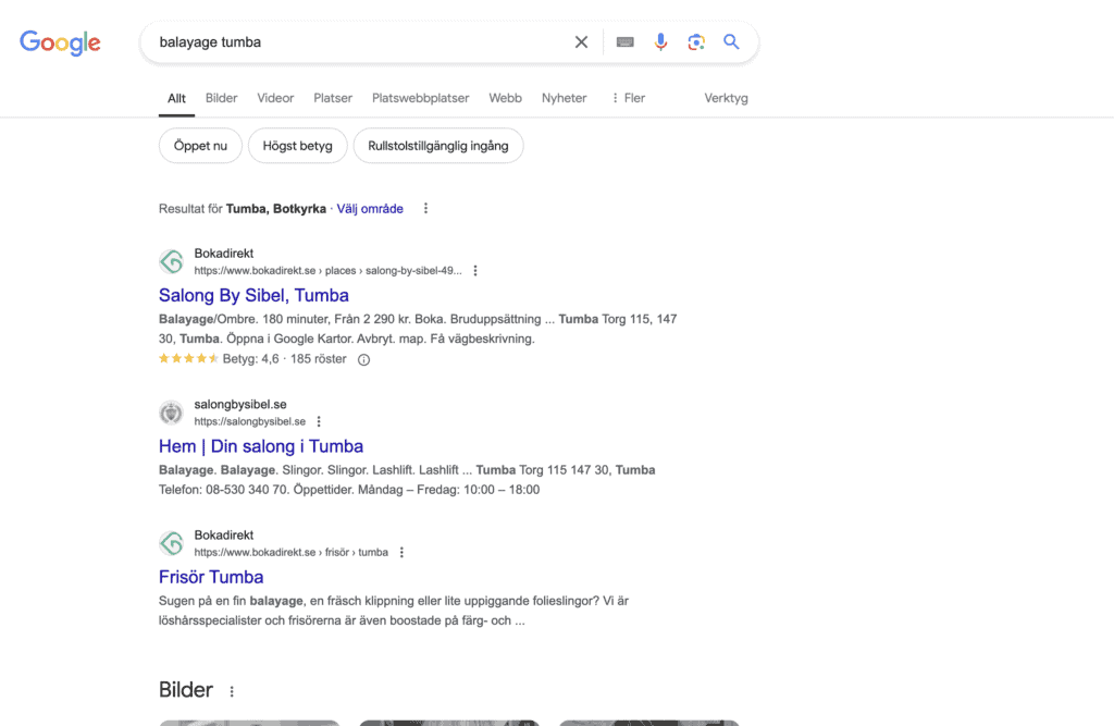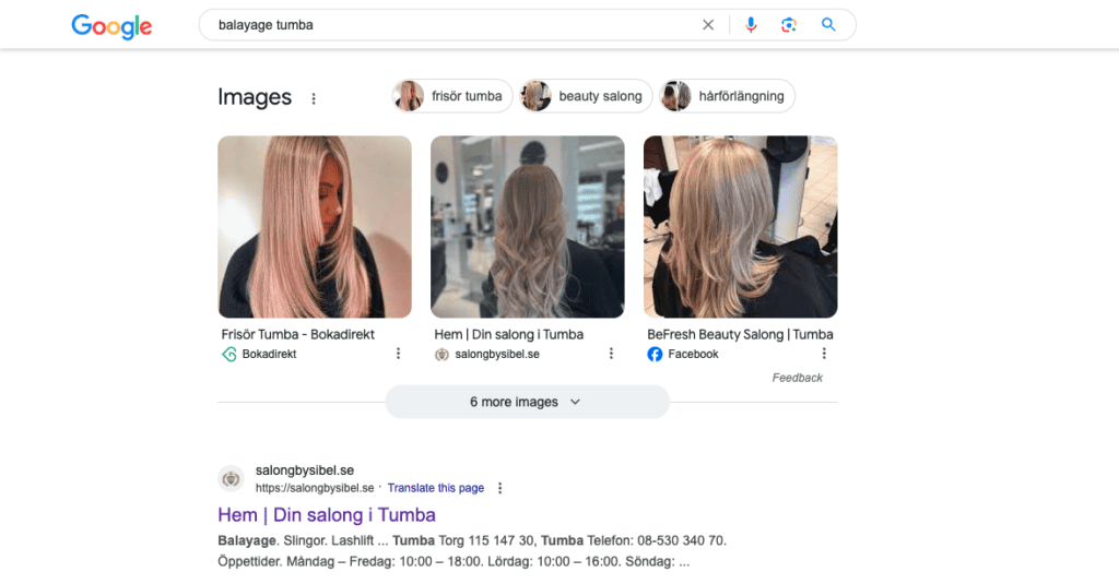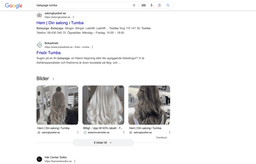En annan fördel med en egen hemsida är en ökad synlighet på Google. Som du kan se nedan, syns Salong By Sibel nu som 4 av de 6 första sökresultaten när någon googlar efter en lokal balayage. Istället för att endast synas som en av många bokadirektlänkar, ser du nu både hemsidan och två bilder från hemsidan tidigt i sökresultaten.